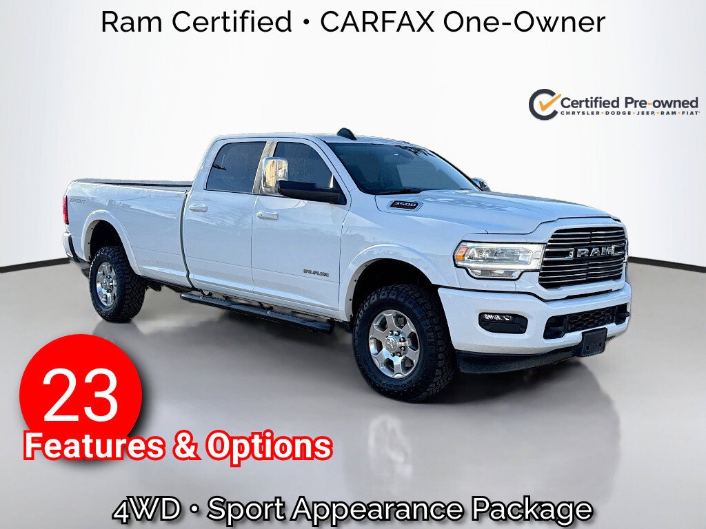 Multi-Point Inspection, w/ Oil Change, Smog Completed, & Full Vehicle Detail Insided & Out, Wiper Blades are New all around, Cabin Air Filter is New, Engine Air Filter is New, 2nd Row In Floor Storage Bins, Auto High Beam Headlamp Control, Black Interior Accents, Body Color Door Handles, Body Color Grille Surround, Center Hub, Chrome Exterior Mirrors, Exterior Mirrors Courtesy Lamps, Exterior Mirrors w/Heating Element, Exterior Mirrors w/Memory, Exterior Mirrors w/Supplemental Signals, Foam Bottle Insert (Door Trim Panel), GPS Navigation, Laramie Level A Equipment Group, Mirror Running Lights, Mirror-Mounted Aux Reverse Lamps, Painted Front Bumper, Painted Rear Bumper, Power Adjustable Convex Aux Mirrors, Power Adjustable Pedals w/Memory, Power Chrome Tow Mirrors w/Convex Spotter & Memory, Power-Folding Mirrors, Quick Order Package 21H Laramie, Rain Sensitive Windshield Wipers, Remote Tailgate Release, Sport Appearance Package, Sport Decal, Trailer Tow Mirrors.